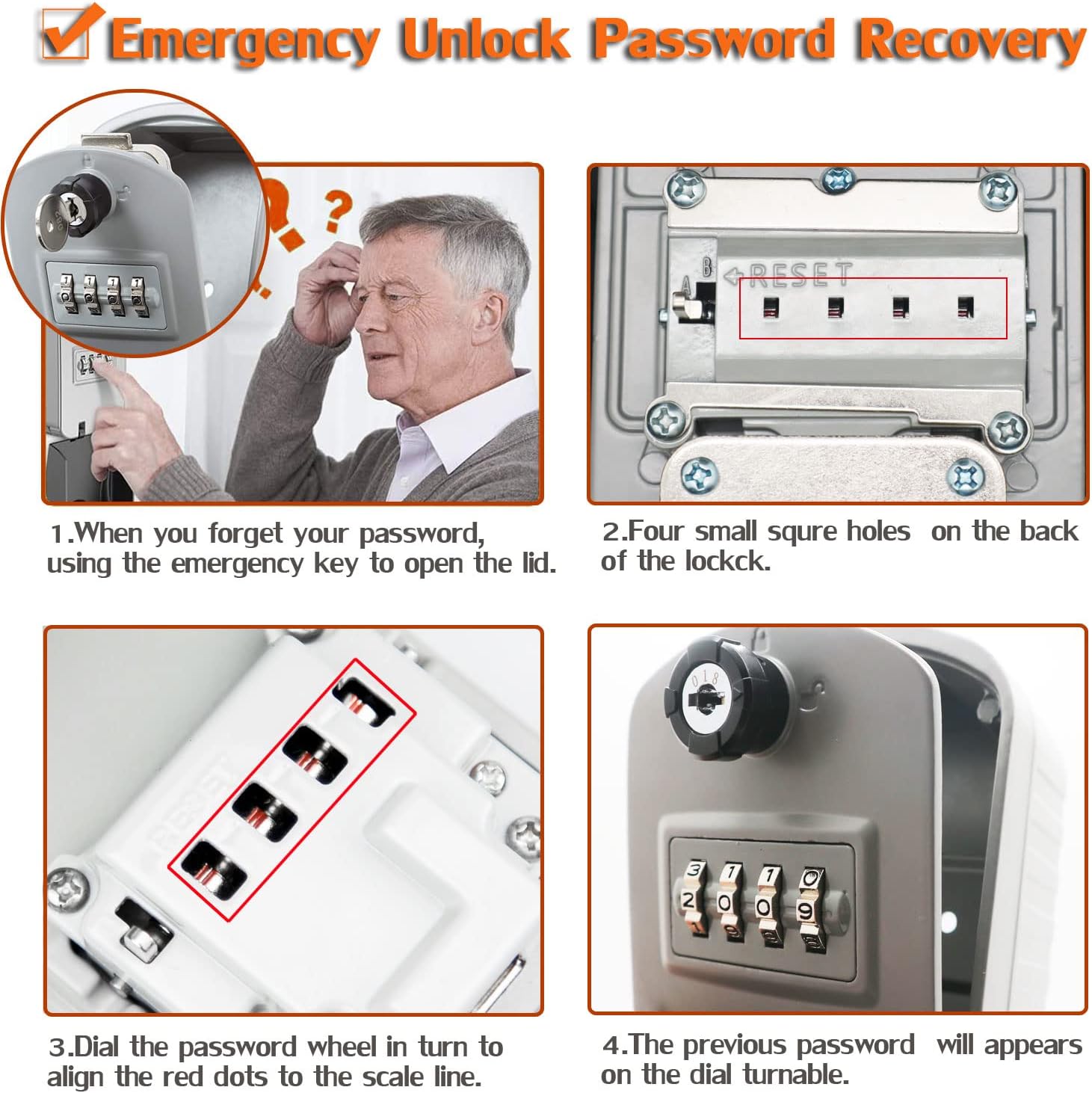 · Sicurezza estremamente elevata - Combinazione a 4 cifre per comodità senza chiave e puoi reimpostare la combinazione per 1000 di opzioni di codice di combinazione personalizzate. Importante: non dimenticare la password o non hai modo di aprire la cassetta di blocco di archiviazione delle chiavi.