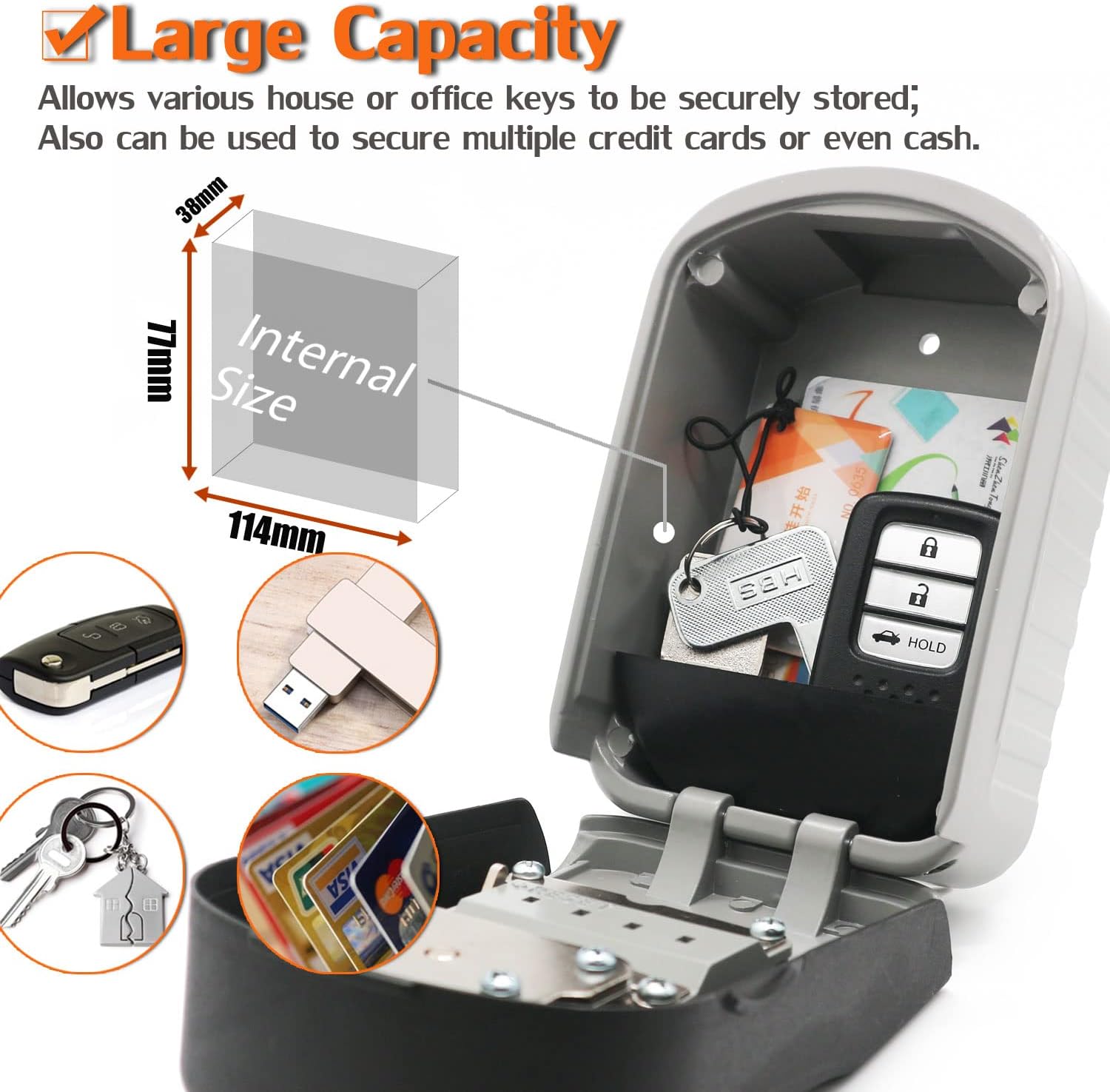Chiave cassetta sicura Blocco codice - Con un ampio spazio di archiviazione (dimensione interna: 114*77,4*38 mm), questa cassetta di blocco chiave memorizzerebbe più chiavi o carte di accesso alla tua porta, ideale per l'ingresso di emergenza, accesso sanitario a domicilio, case per va ogni